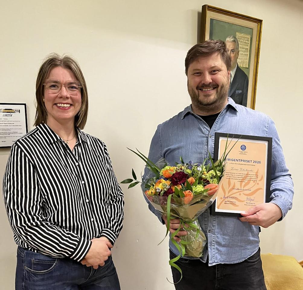 Bildtext: Jurymedlemmen Veronica Svenskberg överraskade pristagaren Tomas Takolander på en körövning.